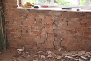 The cottage was very damp and cold inside - our first task was to ascertain the reasons. There are 3 separate injection damp proof courses within the fabric of the building, which have achieved precisely nothing, beyond destroying the structural integrity of the lower courses of brickwork. The obligatory metre high hacking off of plaster and replacement with impervious gypsum plaster had only served to exacerbate the damp problems. High ground levels to some external walls, and layers of impervious gypsum plaster on internal walls, some