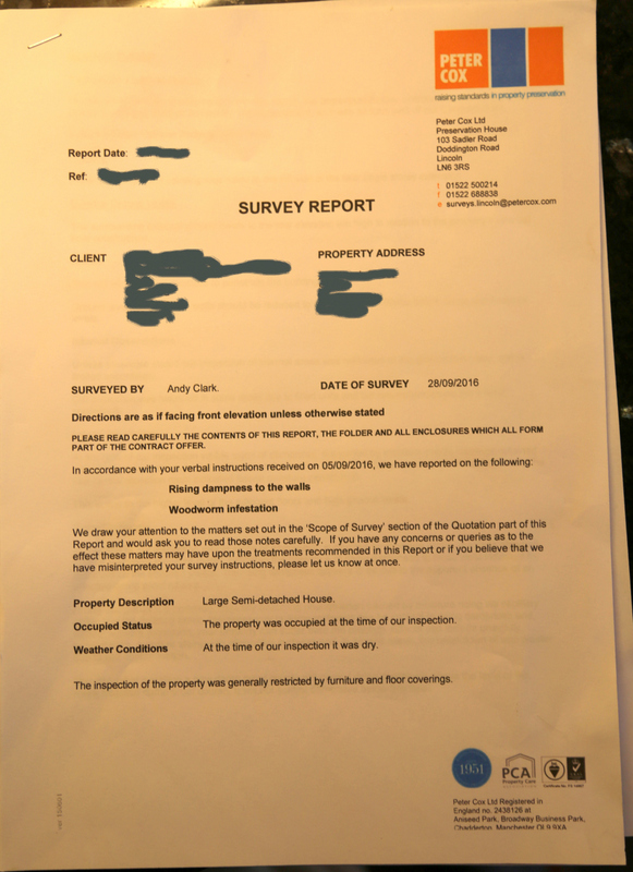 We constantly see examples of the blatant fraud that Property Care Association member Peter Cox Ltd attempts to pull on the unsuspecting public. This example is one of the worst I've seen, and needs to be shouted from the rooftops. These criminals need to be stopped from conning the public once and for all. This was a report prepared by a con artist named Andy Clark, working out of the Lincoln office of Peter Cox. His 'report' is covered in Property Care Association logos. I love their strapline: "Raising Standards in Property Preservation". The best standards of fraudulent trickery and con jobs I've ever seen...
